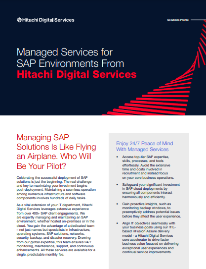 Hitachi Digital Services offers managed services for SAP environments, providing 24/7 support. As an extension of your IT department, Hitachi uses experience from over 400 SAP client engagements to manage your SAP environment, on-premises or in the cloud.